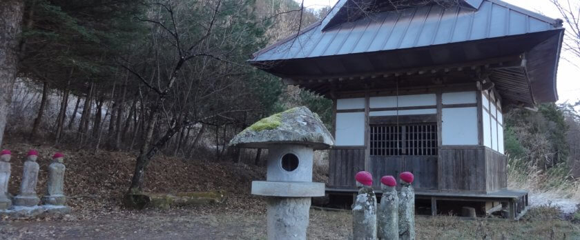 前山の塩野神社の一の鳥居からお宮まで200mほどの直線道路があります。鎌倉時代に流鏑馬が行われていたという道ですが、その道筋に「独鈷山登山口」と書かれた道標があって、それに従って狭い道を南に上っていくと約200m先に柵が見えます。ニホンジカなどの獣害を防ぐためのものですが、そこから先は独鈷山に登っていく本格的な登山口になります。で、その柵のすぐ手前にあるのが小さなお堂です。