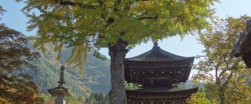 もう11月。「秋深き隣はなにをする人ぞ」という松尾芭蕉の俳句。塩田の神社仏閣を回っていても、隣に人がいなかった今年ですが、やっとお参りに来る人たちが増えてきました。先日前山の前山寺の黄葉はどんなかなあ と行ってみたら、三重塔の銀杏が見頃でした。本堂横から一段上の三重塔の方向を見ると、手前にある銀杏が大きく見え、三重塔と同じ高さかと感じます。今年のこのイチョウは、例年に比べると「真っ黄色」という感じではないのですが、塔の後ろから差し込む陽の光に照らされていい風景。
