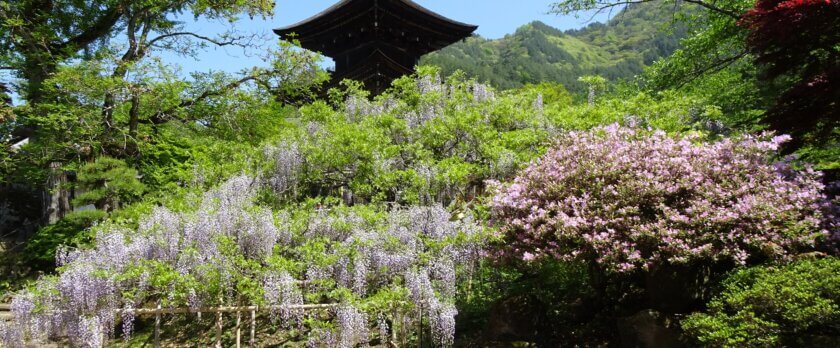 三重塔の前には、見事な藤の花がやっと見頃を迎えました。我が家ではもう散り始めていますが、さすがに百メートル近く標高が上がると違います。