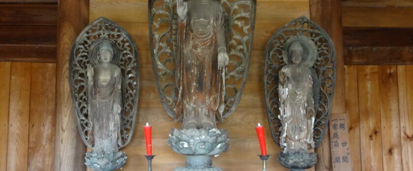 ここの阿弥陀如来像は、ほかとはちょっと変わっています。一般的には「阿弥陀三尊像」といって、阿弥陀像を中心にして、右に観音菩薩像、左に勢至菩薩像が「脇侍」(わきじ)として両脇を固めるのです。が、ここには、三体の仏像があるのですが、いずれも阿弥陀如来像。こういうお姿は、塩田ではここだけです。