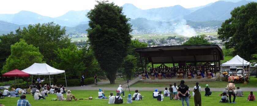 芝生広場の坂の下には屋外の舞台もあって、この7月に行われた日本遺産のイベントでは、和太鼓の演奏会が行われました。客席はもちろん芝生広場、広々した「客席」で寝転がったり好きな格好で楽しめます。