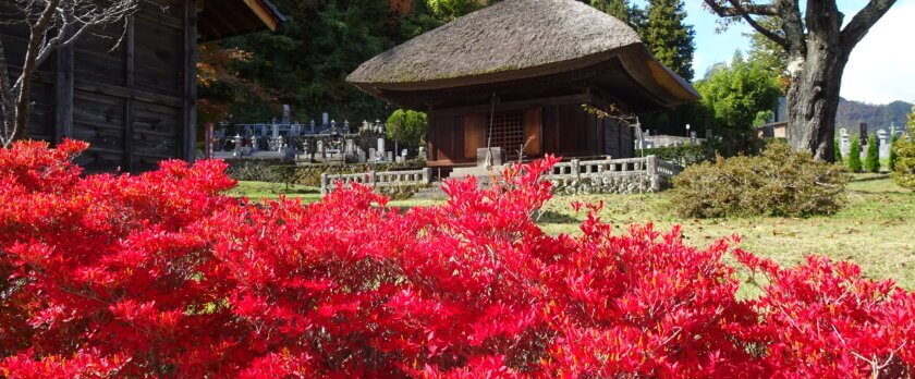 参道を進むと、「赤」の先に薬師堂が見えてきます。岩手県平泉の中尊寺金色堂と同じ「阿弥陀堂形式」の造り。茅葺の屋根が印象的です。