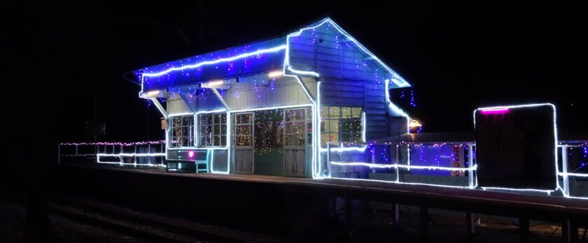 そんな八木沢駅で2月1日から始まったのが夜のイルミネーション。午後5時から11まで点灯されているのですが、駅舎全体が闇の中から浮き出しています。1万5千個ものLED電球が使われているとのこと。