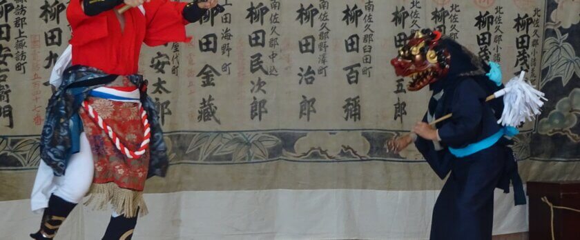 「新町の太々神楽」の3回目、獅子と天狗の対決の場面です。