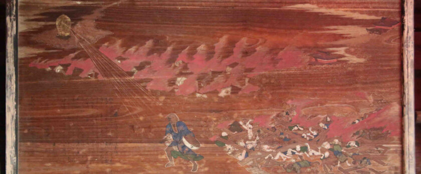 北向観音堂の中に1枚の絵馬が飾ってあります。江戸時代、尾張の市之助という人が仲間と善光寺の御開帳に行くのですが、彼だけその前に北向観音にお参りし、厄除けの御札を持って合流します。そのあと、善光寺大地震があって、多くの人が亡くなりました。市之助の仲間も皆犠牲になる中で、彼だけがお札のおかげで助かった。北向観音の霊験あらたかというわけですね。その様子を絵馬にしたのだそうです。