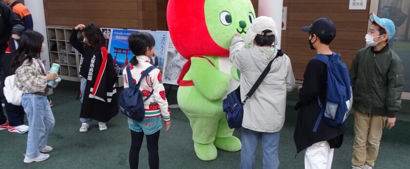 まず出迎えてくれたのが「アルクマ」。長野県のマスコットキャラクターです。久しぶり!!一緒に写真を撮ってもらう子どもたちも次々。