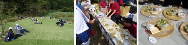 舌喰池には、地元の方が整備した大きな芝生広場があって、池の景色を眺めながら、美味しいものをいただきます。ここで提供されたものは、生ズッキーニやもち米、豆が入ったほうれんそうのジェノベーゼサラダに、松茸のクリームチーズ、峯村牛プレミアムビーフジャーキー。飲物は2種類のシードルと地元の酒造会社若林醸造の紫蘇のジュースです。