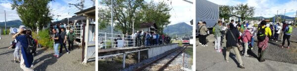集合場所の舞田駅には、午前9時過ぎからたくさんの人が電車から降りてきます。