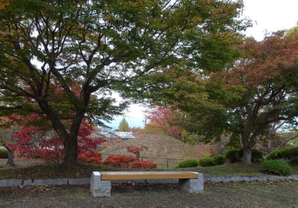 この東山、たくさんの古墳があります。昭和62年(1987年)の上田市の調査で44基が確認されていますが、80基以上あるといわれています。その中でも大きな「他田塚(おさだづか)古墳」や「塚穴原第1号古墳」の周りを整備したのがこの公園です。このあたりで標高が530m。古墳の周りの紅葉もきれいです。