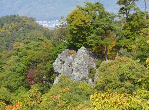 この岩から少し先に行ったところに「大岩」という、これも見晴らしがすばらしいところがあるのですが、ここから明神岩を見ることができます。林の中から見える絶壁の岩。