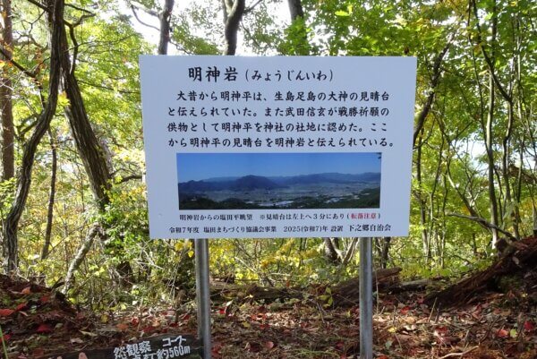 コースの名前のとおり林の中の登山道を上がっていって、尾根に出た所にあったのが明神岩の解説板でした。10月に設置されたばかりで真新しい。下之郷自治会が塩田まちづくり協