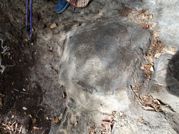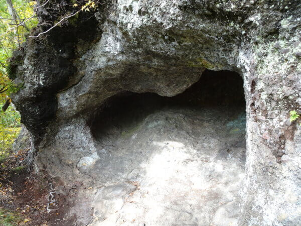 ばくち岩はどこ?と岩壁を見上げると、壁に大きな穴が開いています。解説板の所から急傾斜の細い道を上がると、奥行3mくらい、横幅4mくらいのスペース。決して平ではないのですが、手前には直径50cmほどの磨かれた「博打台」と思われる石があって、ここでサイコロを転がしていたのでしょうか。