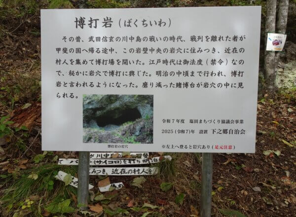 それによると、川中島の戦いの時代、戦列を離れた武田信玄軍の者が甲斐の国に帰るとき、岸壁中央の岩に住みつき、近在の村人を集めて賭博場を開いた。江戸時代は御法度(禁令)なので、密かに岩穴で博打に興じた。明治の中頃まで行われ、博打岩と言われるようになった。磨り減った賭博台が岩の中に見られる。