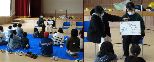 話してくれたのは、長野大学の社会福祉学部の女子学生二人。自己紹介の後、「夢って なんだろう」とか、子どもたちに語りかけるように、そして自分の考えも伝えます。スケッチブックに手書きのフリップで、小学生から未就学児まで幅のある年齢の子どもたちが分かりやすいよう工夫しながら話をしていました。子どもたちも興味を持って、質問も出ていました。