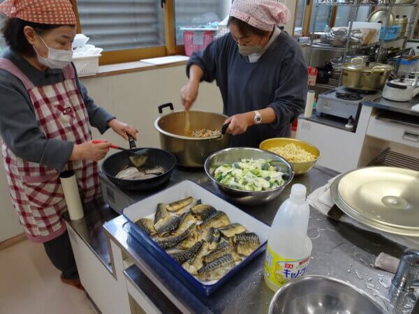 一方、調理室ではお昼の準備。メニューは、とりめしに魚のムニエル、ポテトサラダにすまし汁。デザートはりんごです。