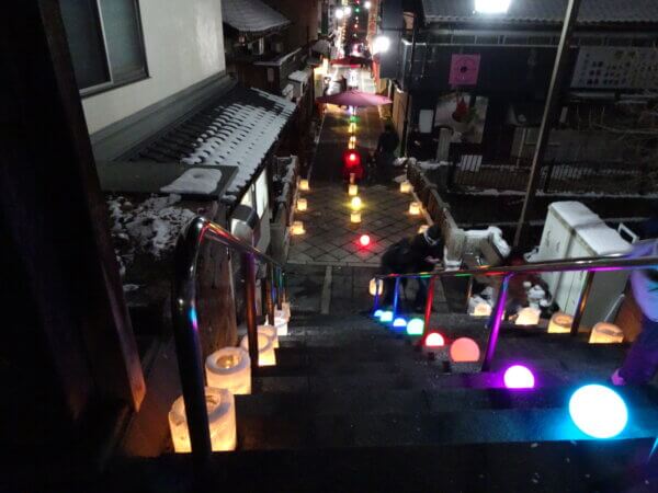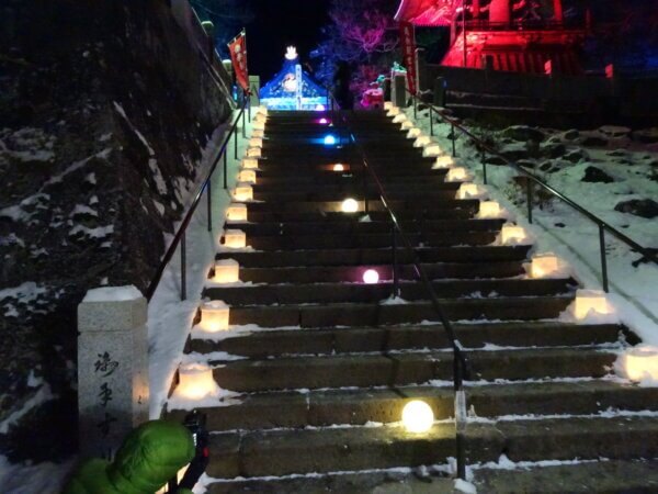 駅から温泉街につながる道を行って、北向観音堂の参道に降りていく階段からズラッと氷灯ろうが並んでいます。