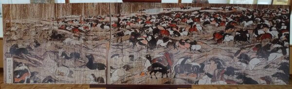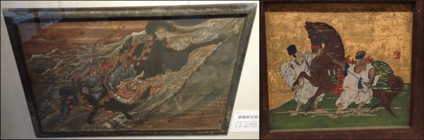 左の絵も板に描かれたもの。「三国志」に出てくる「劉備玄徳」が馬とともに激流に飛び込もうとする一瞬の場面を描いたものだということです。光の反射を抑えるため、絵の上の方から写真を撮っているので台形に見えますけど、実際は長方形です。