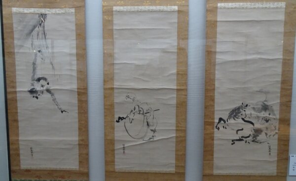 最初の写真は、狩野探幽作の「布袋」。三幅対で、真ん中に布袋様、右に馬、左に猿が描かれています。「え! 探幽の絵がここにあるの!」とビックリ。