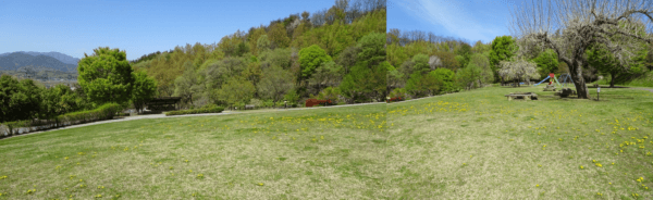 柳沢地区と東前山地区の間にある「山王山公園」。5000平方メートルを超える広々とした芝生広場と野外ステージがある公園ですね。一枚の写真には納まりきらないので、2枚をつなげてみました。北には塩田の田園風景が望めるし、ローラー滑り台やブランコ、すべり台などの遊具もあり、子どもたちにも人気の遊び場です。