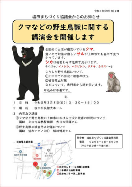 内容及び講師 ①クマなど野生鳥獣の上田市における出没と被害の状況について 講師 上田市森林整備課 大日方保輝さん ②野生鳥獣の被害防止対策について 講師 協和テクノ(株) 飯川博高さん 日 時 2026年3月8日(日)13:30~15:00 会 場 塩田公民館大ホール その他 入場は無料です。 事前申込は不要です。当日会場にお越しください。